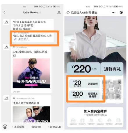 新用戶關(guān)注公眾號【UrbanRevivo】即收到自動歡迎語,針對新用戶推出新人首單95折優(yōu)惠,利用折扣福利,如無門檻20元優(yōu)惠券等吸引用戶加入官方福利社群。