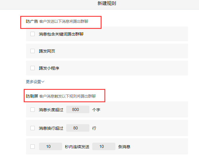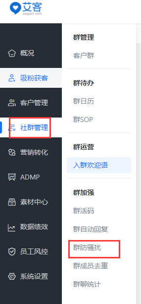 如果企業(yè)嫌手動(dòng)設(shè)置比較麻煩,可以嘗試使用艾客SCRM的群防騷擾功能。配置防騷擾規(guī)則,群客戶(hù)發(fā)送的消息命中規(guī)則時(shí),該成員將會(huì)被踢出群聊或收到警告消息,企業(yè)用戶(hù)可通過(guò)點(diǎn)擊后臺(tái)功能板塊跳轉(zhuǎn)至企業(yè)微信后臺(tái)設(shè)置。