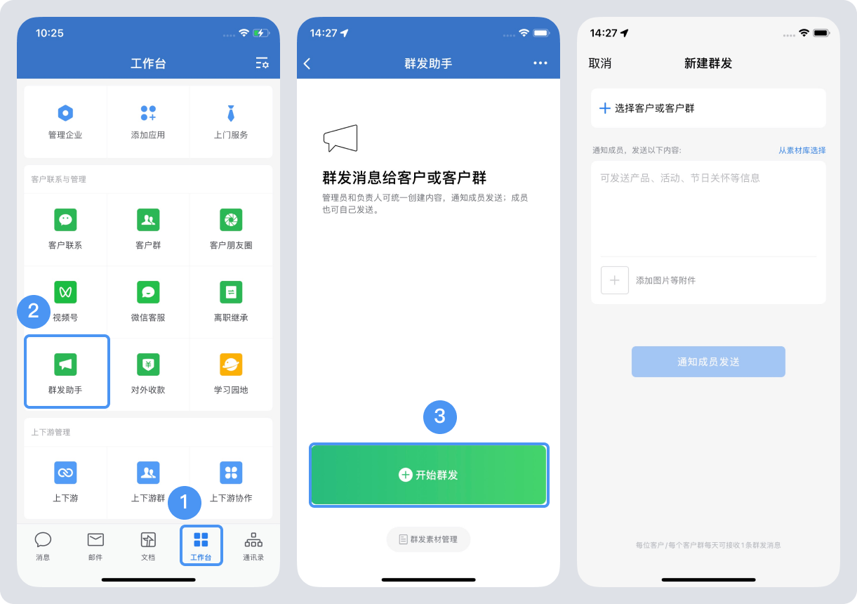 企業微信可以通過手機端的:工作臺——客戶聯系——群發助手,完成對企業微信好友的群發,而通過手機端的:工作臺——客戶群——客戶群群發,完成對企業微信社群的群發消息需求。