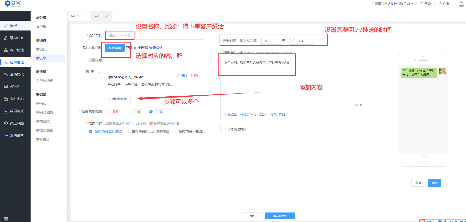 企業微信想要實現定時群發,可以使用艾客SCRM系統的【群SOP】功能。企業只需要提前設置好相關的群發消息內容,群主到時間就會收到群發任務提醒,將消息準確無誤地發送到群內。