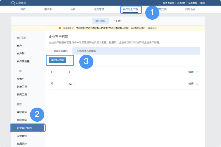 企業標簽可以由企業微信管理員在管理端或者手機端進行添加,方便企業成員給客戶打上標簽。企業管理員登錄企業微信后臺,在“客戶與上下游”——“客戶聯系”——“企業客戶標簽”設置標簽。